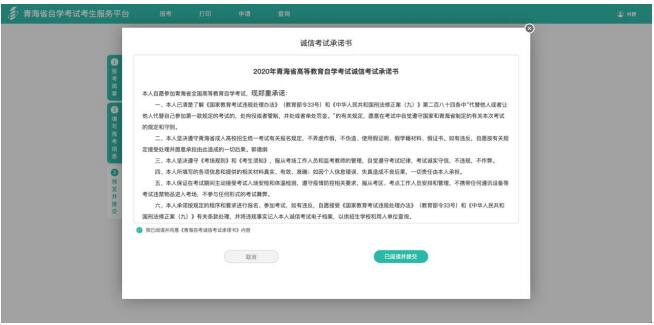 【閱讀誠信考試承諾書】在彈出的誠信考試承諾書頁面中勾選“我已閱讀并同意《青海自考誠信承諾書》內(nèi)容”,并點擊“已閱讀并提交”。