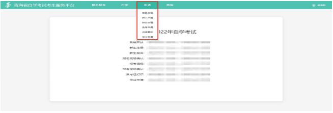 (1)進入青海省自學(xué)考試考生服務(wù)平臺,找到頁面上方“申請”并在彈出的菜單中選擇“變更申請”;