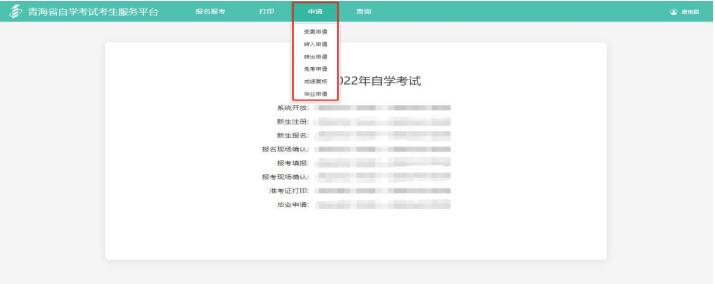 (1)進入青海省自學(xué)考試考生服務(wù)平臺,找到頁面上方“申請”并在彈出的菜單中選擇“轉(zhuǎn)入申請”;