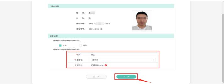 (3)根據(jù)頁面提示,選擇要變更的信息上傳證明附件,點擊“下一步”;
