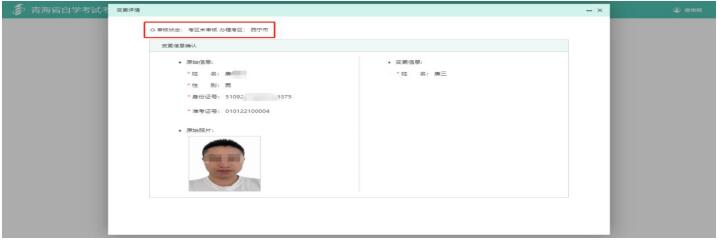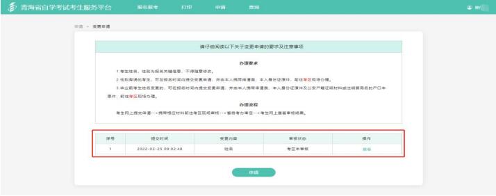 (5)提交變更審核后,返回變更申請頁面,可查看所提交的變更記錄,點擊對應(yīng)記錄的“查看”按鈕即可查看該申請記錄的詳情。審核不通過的考生請仔細閱讀詳情中的不通過原因,完善后重新提交。