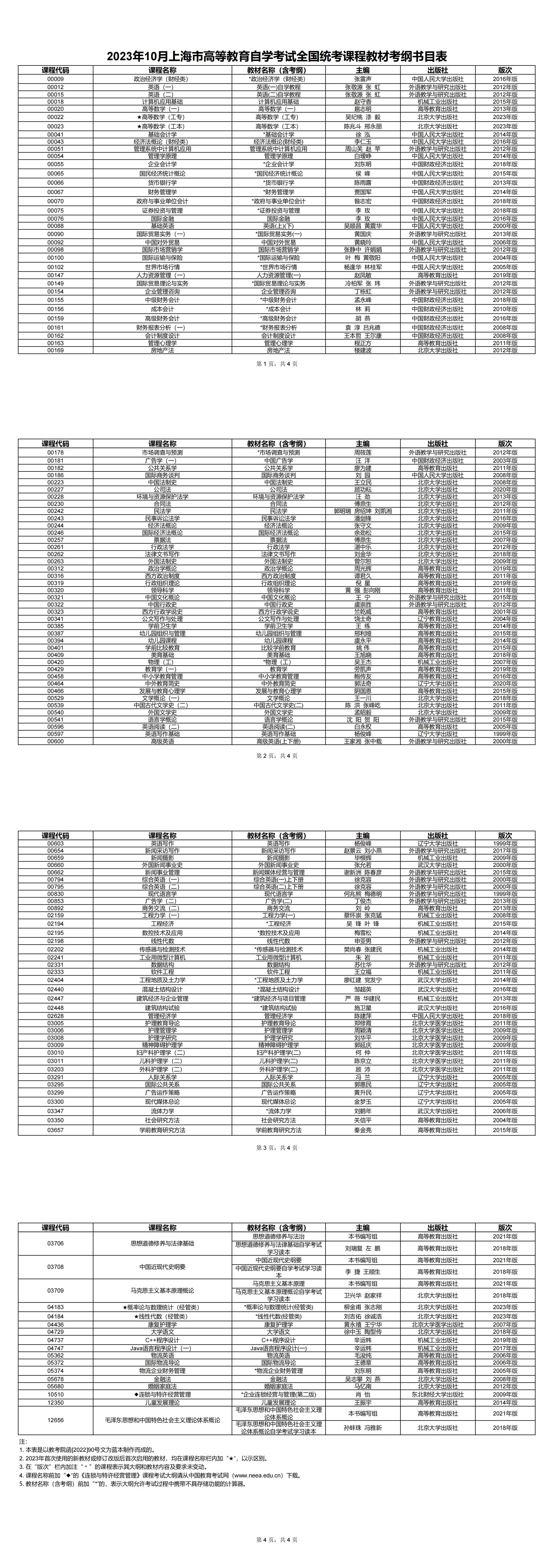 2023年10月上海市高等教育自學(xué)考試教材考綱書(shū)目表