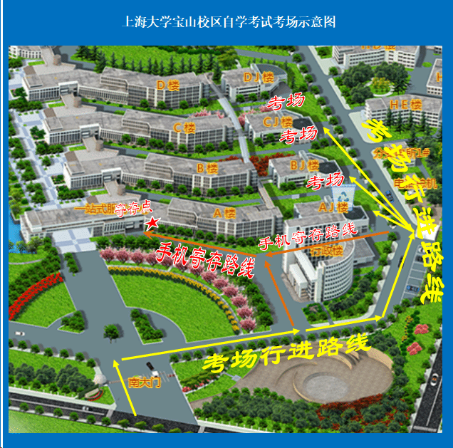 2024年上半年上海大學(xué)自學(xué)考試?yán)碚撜n考試市區(qū)考點(diǎn)全部安排在上海大學(xué)寶山校區(qū)進(jìn)行,每場(chǎng)考試座位號(hào)對(duì)應(yīng)樓宇分布詳見(jiàn)下表。考生一律憑有效身份證件原件、準(zhǔn)考證從上大路99號(hào)南門(mén)進(jìn)入考點(diǎn),按照指定路線至座位號(hào)對(duì)應(yīng)樓宇,其后在該樓宇外查看當(dāng)次考試所在具體教室。
