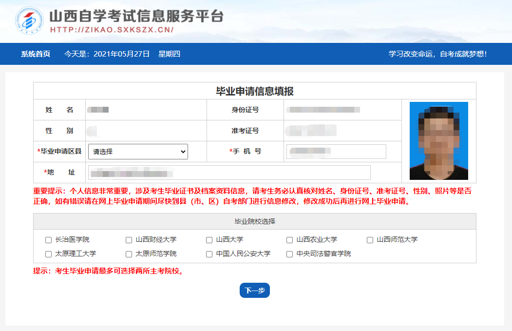 提示:個(gè)人信息非常重要,涉及考生畢業(yè)證書(shū)及檔案資料信息,請(qǐng)考生務(wù)必認(rèn)真核對(duì)姓名、身份證號(hào)、準(zhǔn)考證號(hào)、性別、照片等是否正確,如有錯(cuò)誤請(qǐng)?jiān)诰W(wǎng)上畢業(yè)申請(qǐng)期間盡快到縣(市、區(qū))自考部門(mén)進(jìn)行信息修改,修改成功后再進(jìn)行網(wǎng)上畢業(yè)申請(qǐng)。
