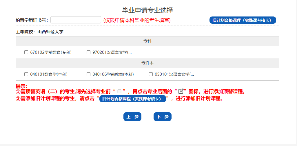 提示:需頂替英語(yǔ)(二)的考生,請(qǐng)先選擇專(zhuān)業(yè)前“□”,再點(diǎn)擊專(zhuān)業(yè)后面的“ ”圖標(biāo),進(jìn)行添加頂替課程。需添加舊計(jì)劃課程的考生,請(qǐng)點(diǎn)擊“舊計(jì)劃合格課程(實(shí)踐課考核卡)”,進(jìn)行添加舊計(jì)劃課程。