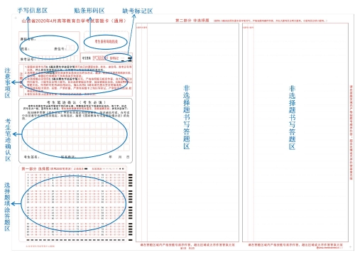 答題卡的格式:答題卡設(shè)計(jì)采用主客觀一體化設(shè)計(jì),選擇題和非選擇題的答題區(qū)域在同一張答題卡上。答題卡分通用卡、專用卡兩種類型。大部分科目使用通用卡,少數(shù)含特殊題型的科目使用專用卡,專用卡在通用卡的基礎(chǔ)上加上特殊題型。