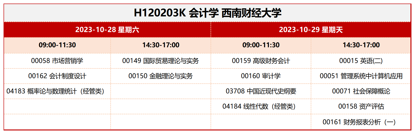 按照本次考試安排,考生可在2天內參加4場考試,報名報考本專業(yè)的考生只需認準西南財經(jīng)大學-會計學-本科,專業(yè)代碼為H120203K。