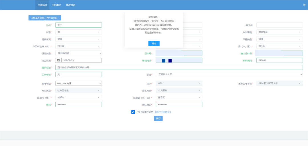 (二)勾選“我已閱讀并同意用戶協(xié)議”,然后點(diǎn)擊“保存”按鈕以保存考生基本信息。