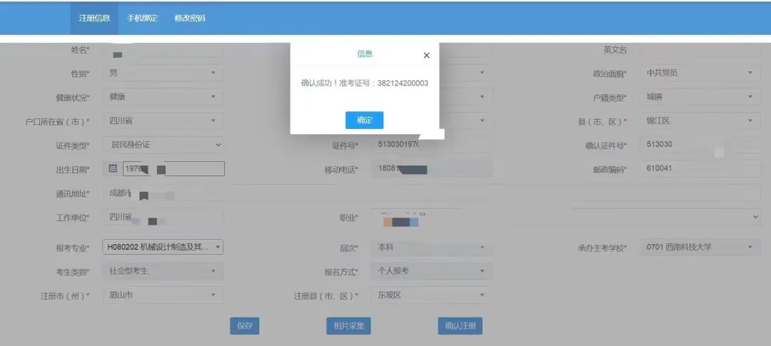 相片采集核驗(yàn)通過(guò)后,點(diǎn)擊“確認(rèn)注冊(cè)”按鈕,系統(tǒng)將生成考生的準(zhǔn)考證號(hào),注冊(cè)流程完成。