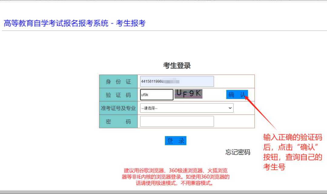 2.輸入正確的驗(yàn)證碼后,點(diǎn)擊“確認(rèn)”按鈕,查詢自己的準(zhǔn)考證號(hào)。