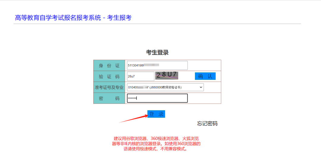 1.選擇要報(bào)考的準(zhǔn)考證后,輸入密碼,點(diǎn)擊“登錄”進(jìn)入系統(tǒng)。新注冊(cè)考生以自行設(shè)置的密碼登錄,在籍考生登錄系統(tǒng)的初始密碼為本人有效居民身份證號(hào)碼后6位(原密碼失效)。