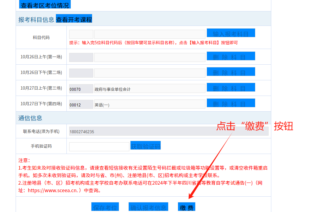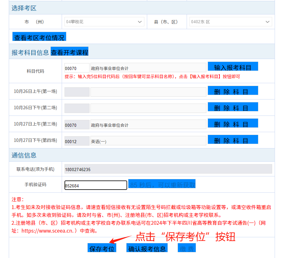 6.輸入收到的短信驗(yàn)證碼,點(diǎn)擊“保存考位”。
