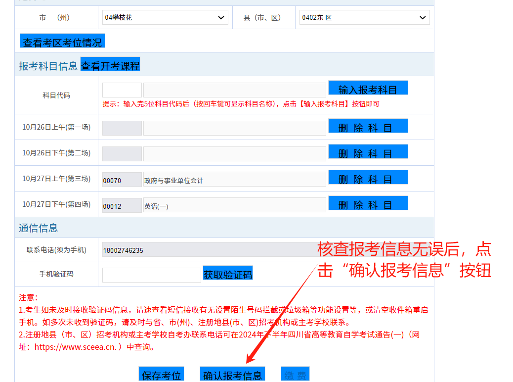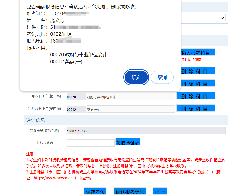 7.“確認(rèn)報(bào)考信息”,課程一經(jīng)確認(rèn),則無(wú)法更換考區(qū)和更改科目信息。