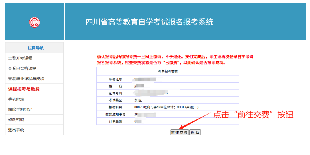 1.核對(duì)訂單信息。無(wú)誤后點(diǎn)擊“前往交費(fèi)”按鈕。