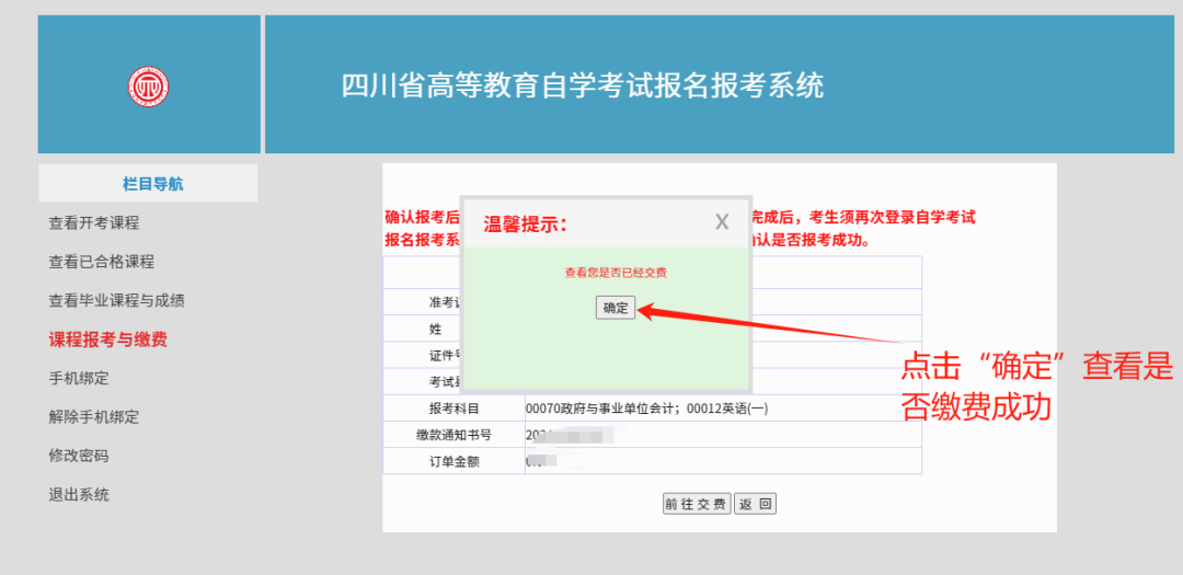 3.考生須再次確認(rèn)是否前往交費(fèi),點(diǎn)擊“確定”。系統(tǒng)彈出支付頁(yè)面(若無(wú)彈出,請(qǐng)檢查是否瀏覽器對(duì)彈出式窗口做了攔截)。