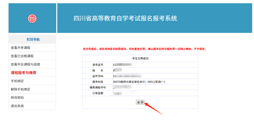6.查看是否交費(fèi)成功。檢查無(wú)誤后,點(diǎn)擊“返回”按鈕。