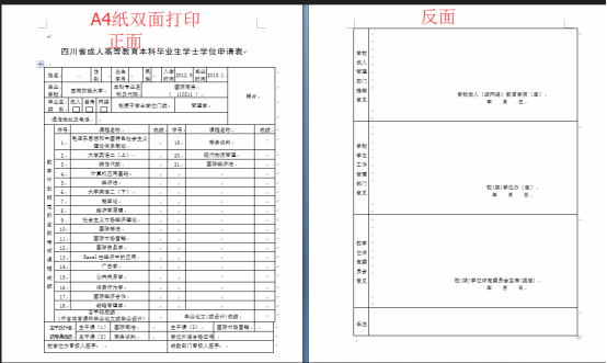 (二)完成網(wǎng)上信息申報(bào)后,學(xué)院將在2個(gè)工作日內(nèi)進(jìn)行初審,學(xué)生須及時(shí)關(guān)注,審核未通過的須按頁面提示信息在申請(qǐng)時(shí)限內(nèi)修改后再次提交,直至審核通過。審核通過的學(xué)生方可打印《基本信息登記表》和《四川省成人高等教育本科畢業(yè)生學(xué)士學(xué)位申請(qǐng)表》(后面簡(jiǎn)稱學(xué)位申請(qǐng)表)。《學(xué)位申請(qǐng)表》為正反兩面,須按打印設(shè)置要求使用A4紙雙面打印如圖: