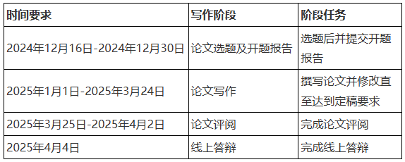 2.2025年1月1日至2025年3月24日,論文寫作階段,考生需要在此時(shí)間段內(nèi)根據(jù)指導(dǎo)老師意見修改論文,在規(guī)定時(shí)間內(nèi)提交達(dá)到定稿要求的論文。