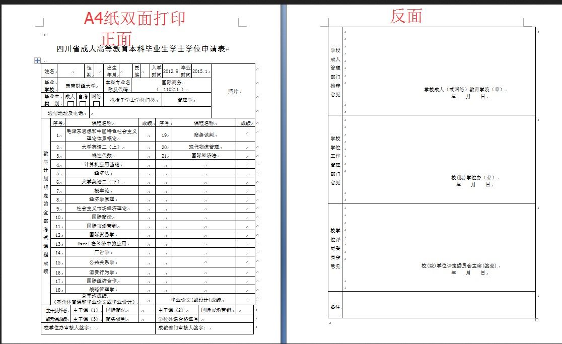 (二)完成網(wǎng)上信息申報(bào)后,學(xué)院將在2個(gè)工作日內(nèi)進(jìn)行初審,學(xué)生須及時(shí)關(guān)注,審核未通過(guò)的須按頁(yè)面提示信息在申請(qǐng)時(shí)限內(nèi)修改后再次提交,直至審核通過(guò)。審核通過(guò)的學(xué)生方可打印《基本信息登記表》和《四川省成人高等教育本科畢業(yè)生學(xué)士學(xué)位申請(qǐng)表》(后面簡(jiǎn)稱(chēng)學(xué)位申請(qǐng)表)。《學(xué)位申請(qǐng)表》為正反兩面,須按打印設(shè)置要求使用A4紙雙面打印如圖: