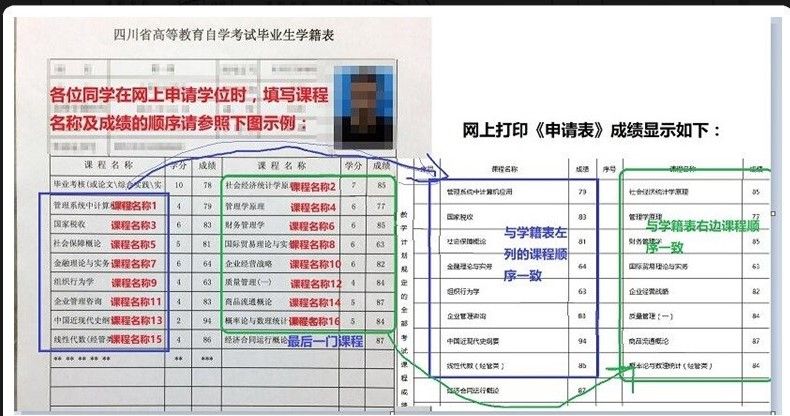 (三)自考畢業(yè)生網(wǎng)上申請(qǐng)時(shí),需要在“其它信息填寫(xiě)”中自行填報(bào)課程名稱(chēng)及成績(jī),為保證最后網(wǎng)上打印的《學(xué)位申請(qǐng)表》中課程順序符合要求,請(qǐng)務(wù)必按下圖所示順序填報(bào):