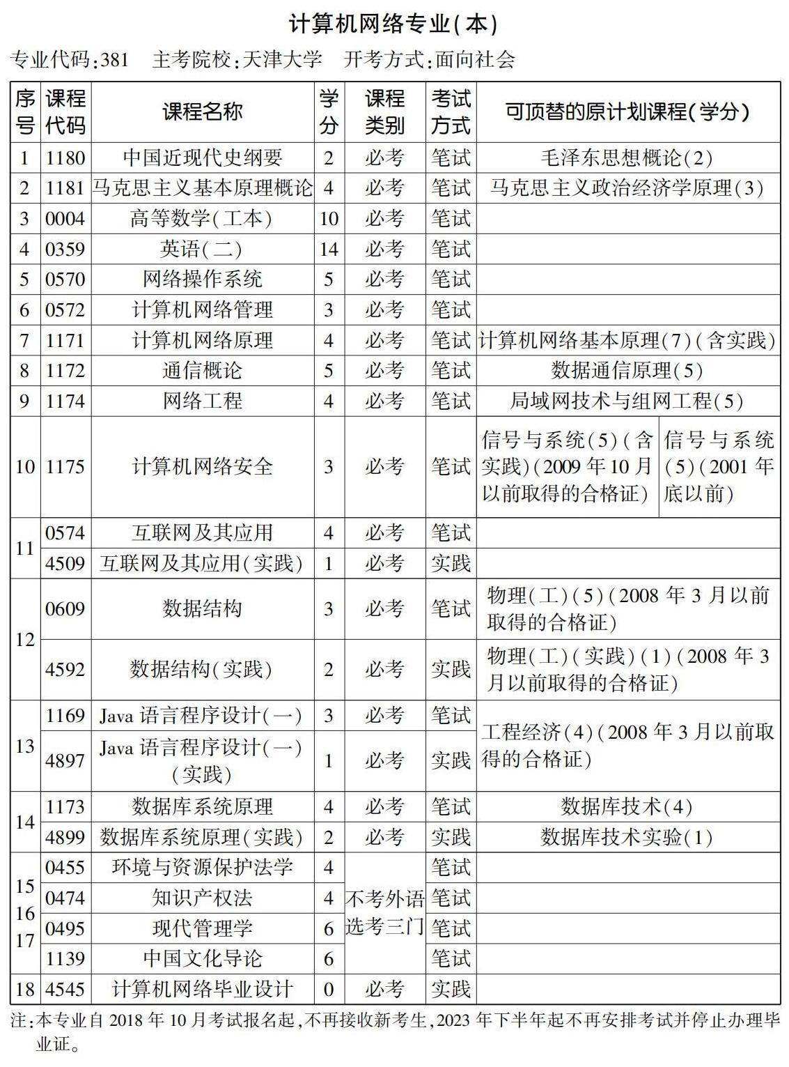 2022年10月天津自考本科計(jì)算機(jī)網(wǎng)絡(luò)專業(yè)計(jì)劃(停考過渡)