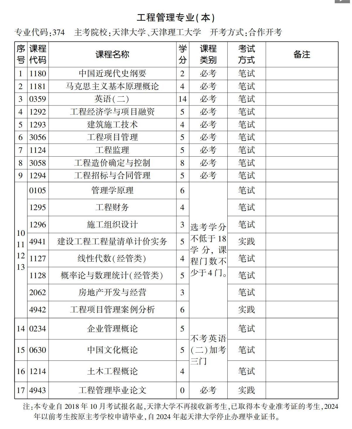 2023年10月天津自考本科工程管理專業(yè)計劃
