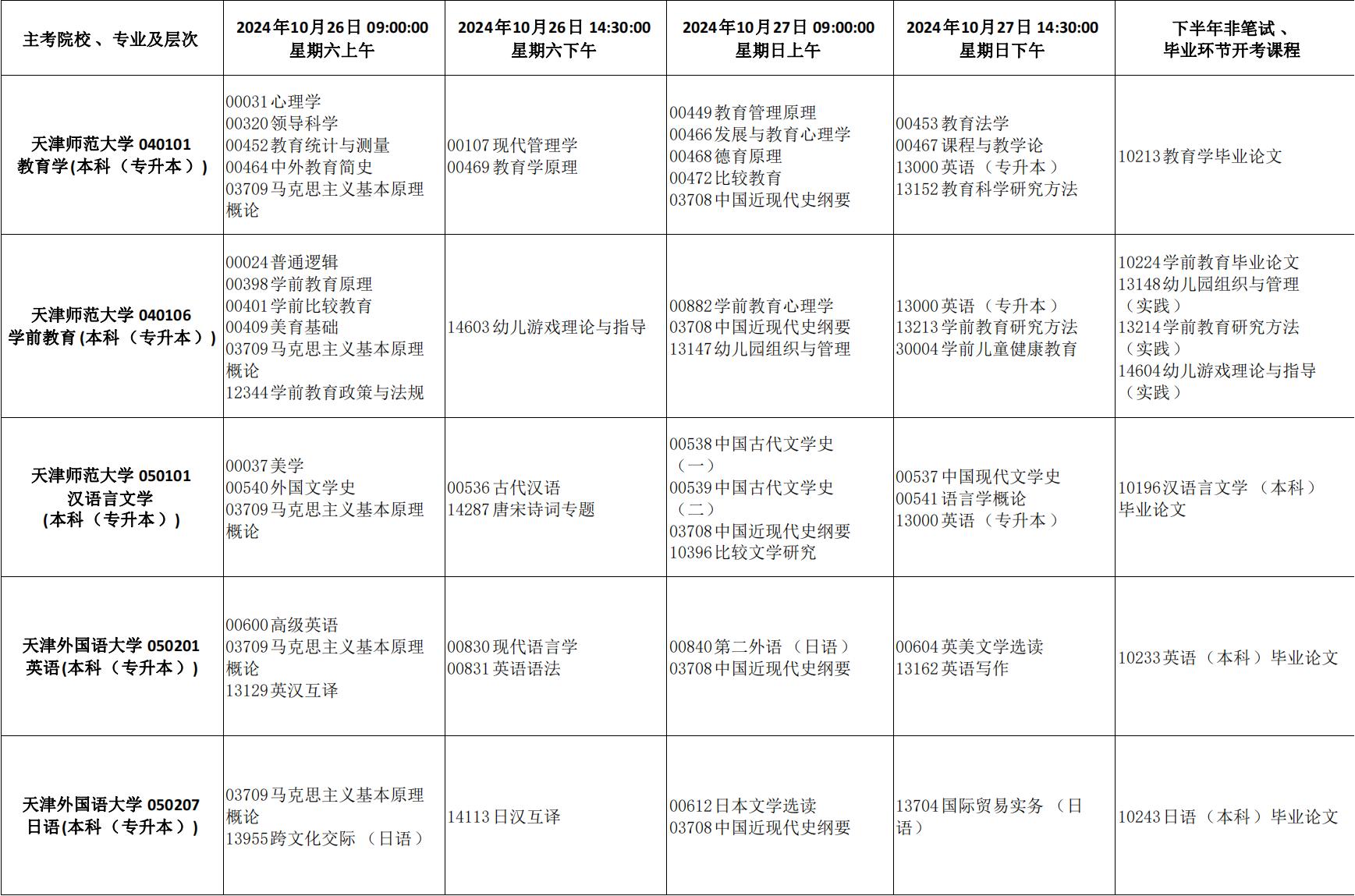 2024年10月天津市高等教育自學考試課程考試時間安排表