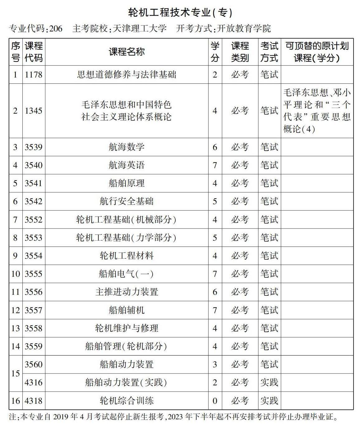 2023年4月天津自考專科輪機(jī)工程技術(shù)專業(yè)計劃(停考過渡)