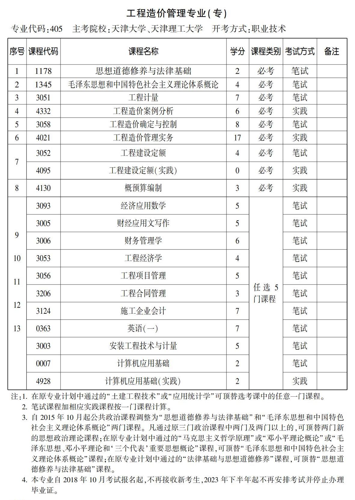 2023年4月天津自考專科工程造價管理專業(yè)計劃(停考過渡)