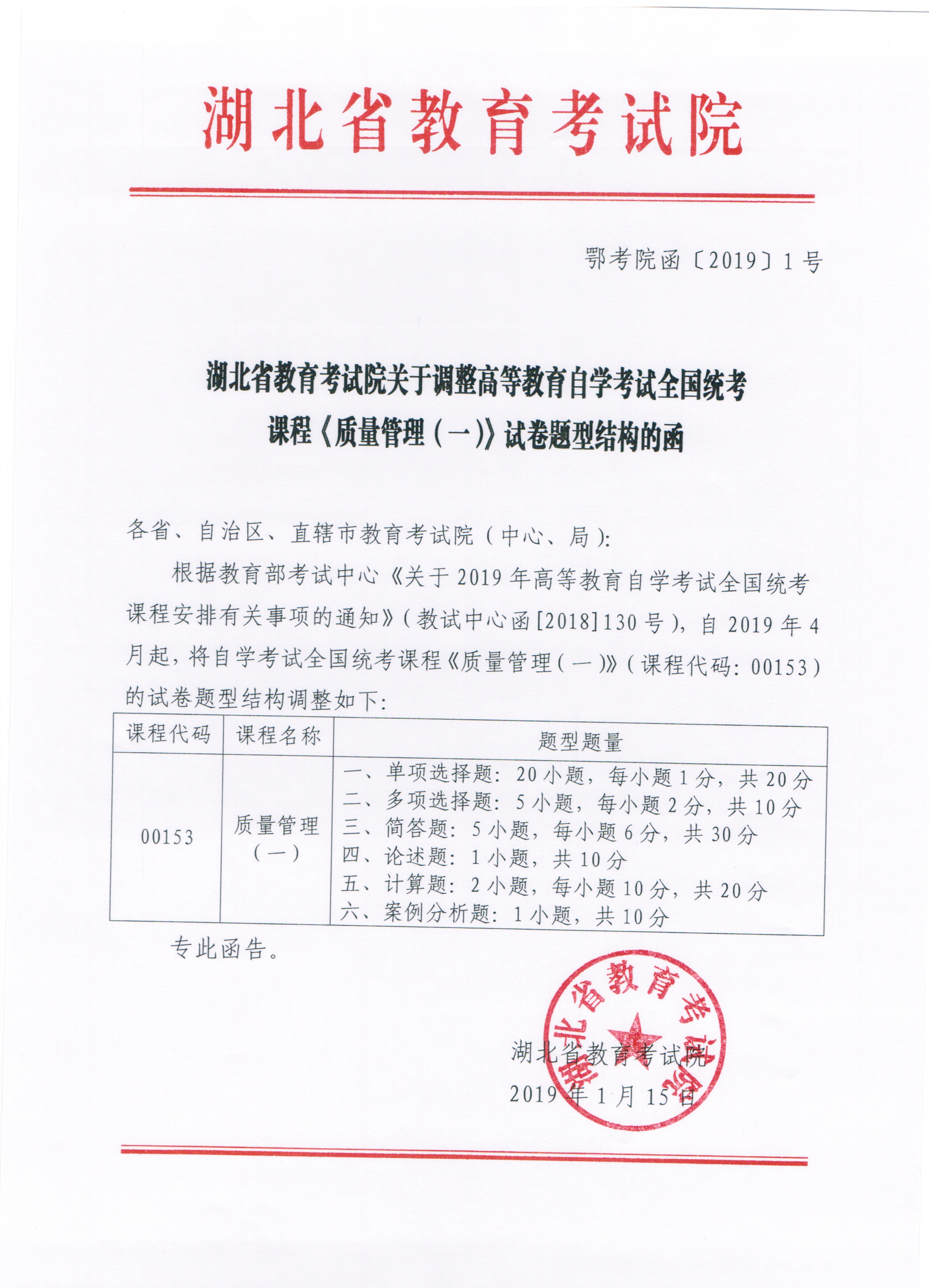 2019年全國統(tǒng)考課程《質(zhì)量管理(一)》試卷結(jié)構(gòu)調(diào)整通知