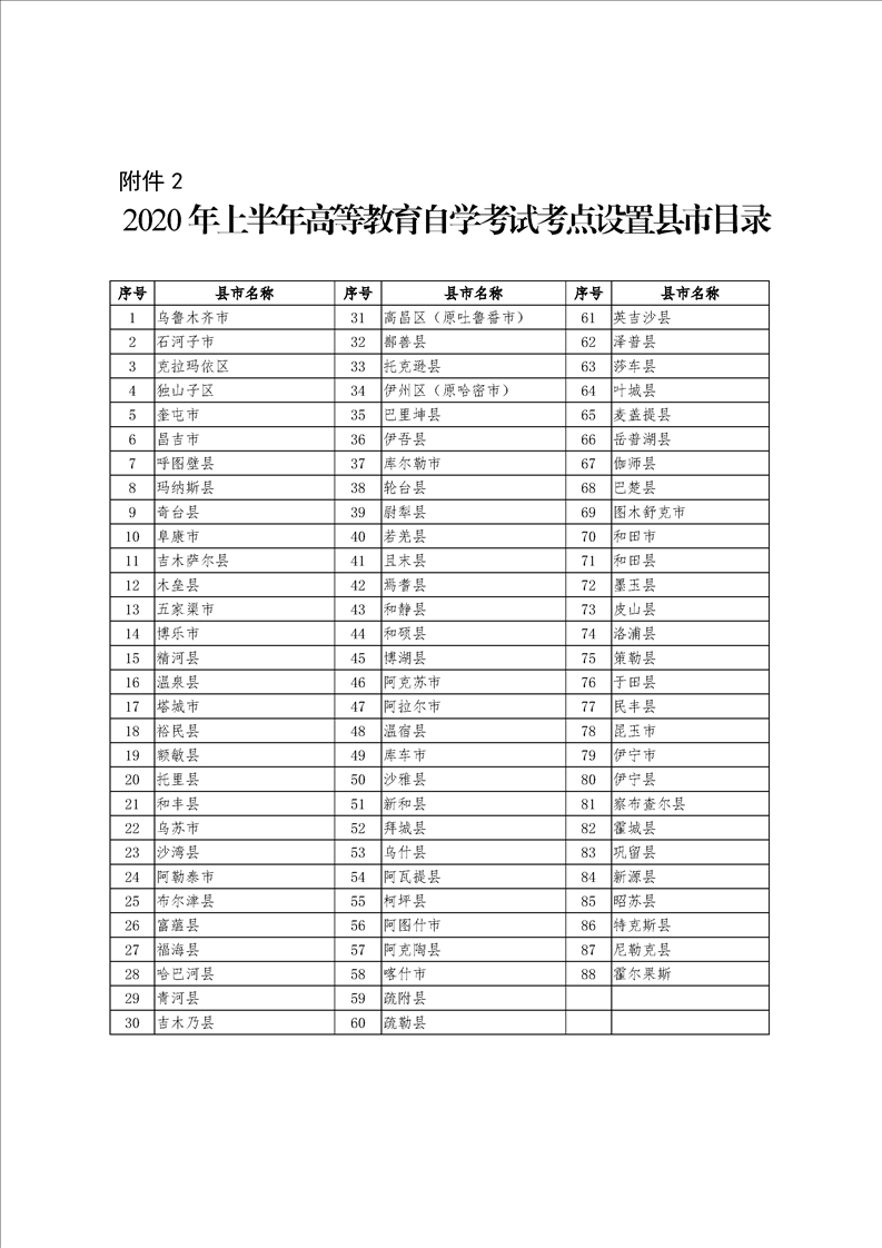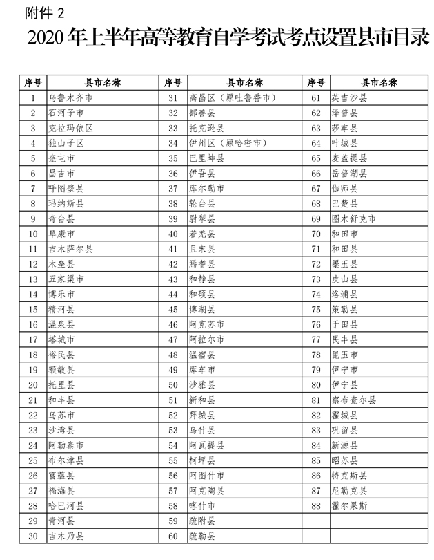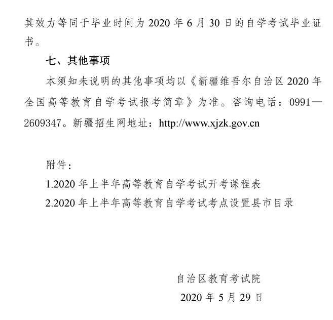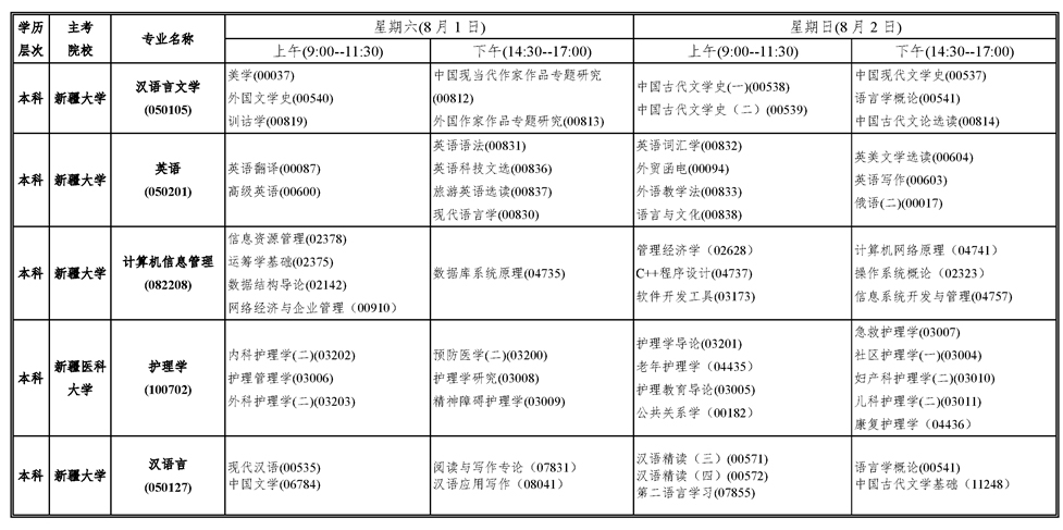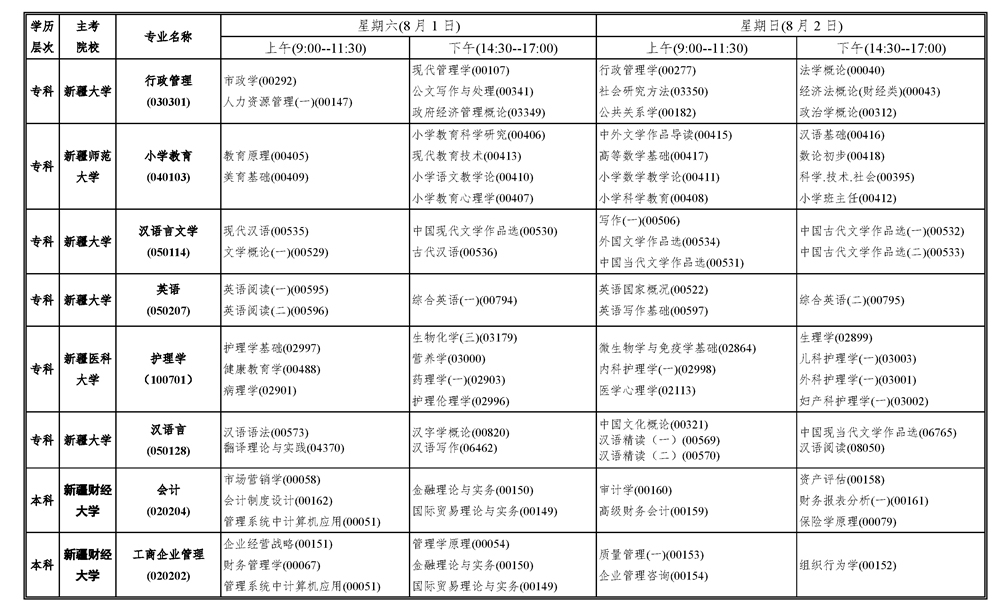2020年上半年新疆自考考試課程安排表
