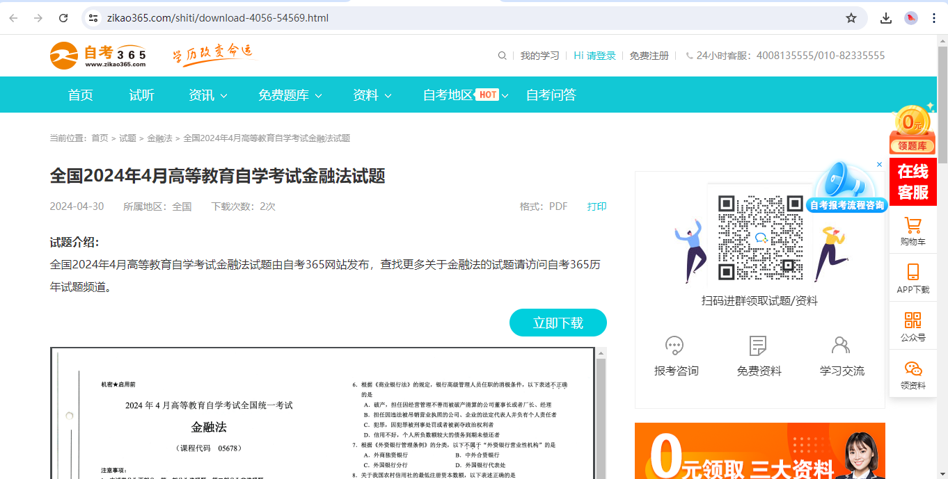 第四步:在搜索結果中,點擊您需要的某個考期的試題,進入試題詳情頁后,您可以選擇在線預覽試題,或點擊【立即下載】按鈕,即可把試題下載在電腦上。如下圖所示: