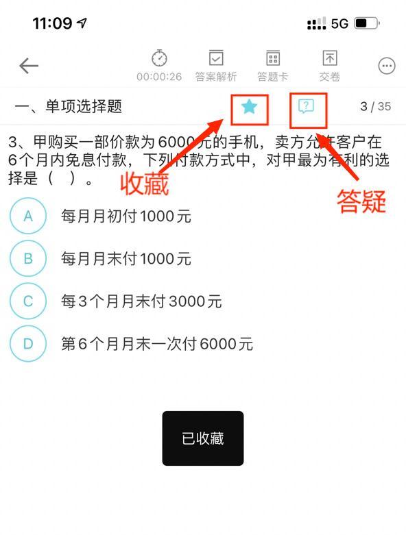在做題過程中,考生可以點(diǎn)擊收藏標(biāo)志將重要的習(xí)題收藏,以便反復(fù)練習(xí),同時(shí),對(duì)于試題有所疑惑,可以點(diǎn)擊答疑按鈕,進(jìn)行提問,會(huì)有專業(yè)教務(wù)老師為您在線答疑。