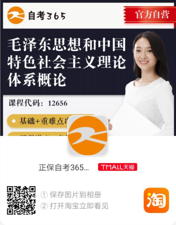 第一步:保存下方圖片,打開“淘寶”立即看見;或在淘寶搜索店鋪【自考365服務旗艦店】關注店鋪即可。