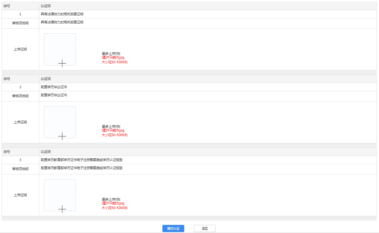第二步:上傳證明材料,根據(jù)系統(tǒng)提示,上傳前置學(xué)歷證明材料信息,如有多個(gè)學(xué)歷,建議上傳最高學(xué)歷證明材料。