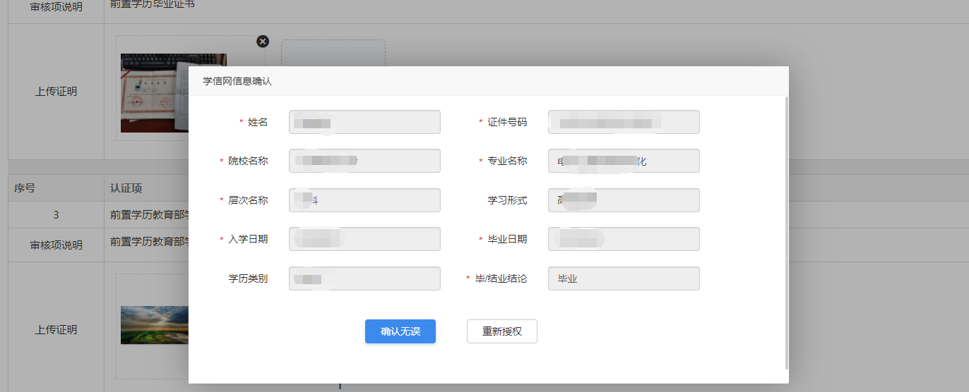 1.如查詢(xún)到學(xué)歷信息,系統(tǒng)展示查詢(xún)到的學(xué)歷信息,確認(rèn)無(wú)誤后,點(diǎn)擊“確認(rèn)無(wú)誤”按鈕。