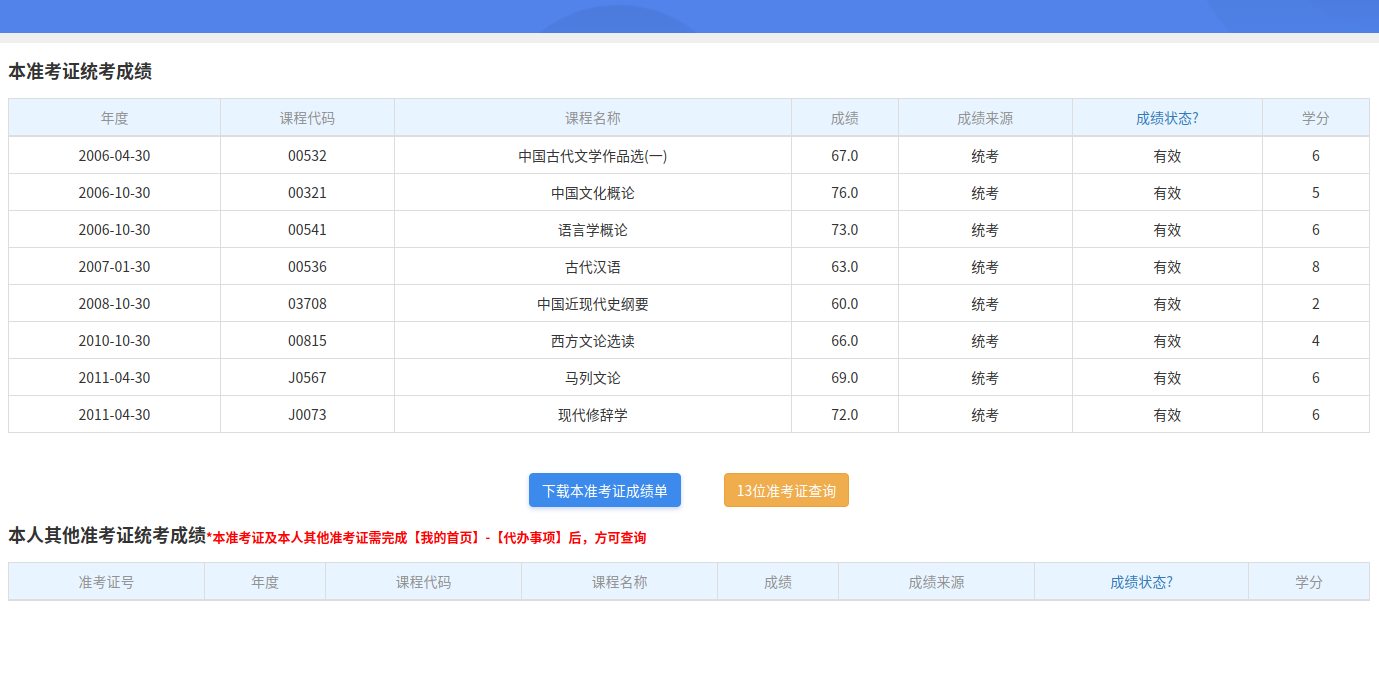 點擊“我的成績”菜單,可以查詢登陸準(zhǔn)考證的統(tǒng)考成績、其他成績、本人其他準(zhǔn)考證的成績。頁面如下: