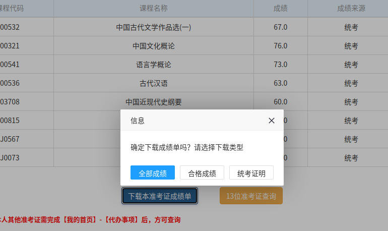 點擊“下載本準(zhǔn)考證成績單”,可以下載“全部成績”、“合格成績”、“統(tǒng)考證明”(含公章)。