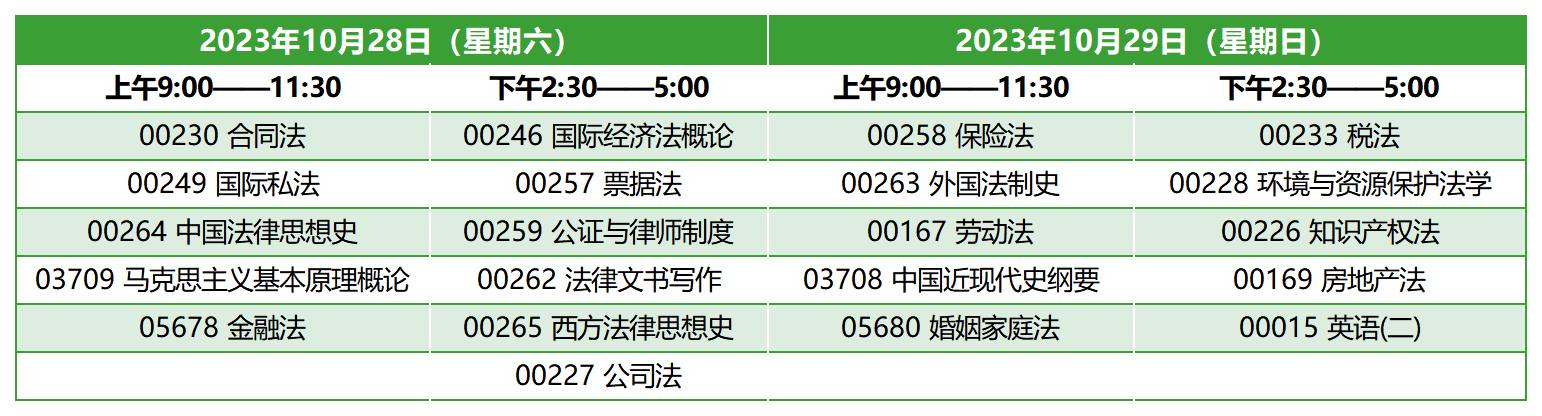 浙江自考本科法學(xué)專業(yè)(原專業(yè)名稱:法律),專業(yè)代碼030101K(原專業(yè)代碼:1030106),2023年10月自考考試時(shí)間為10月28日-29日,上午9:00-11:30,下午14:30-17:00。